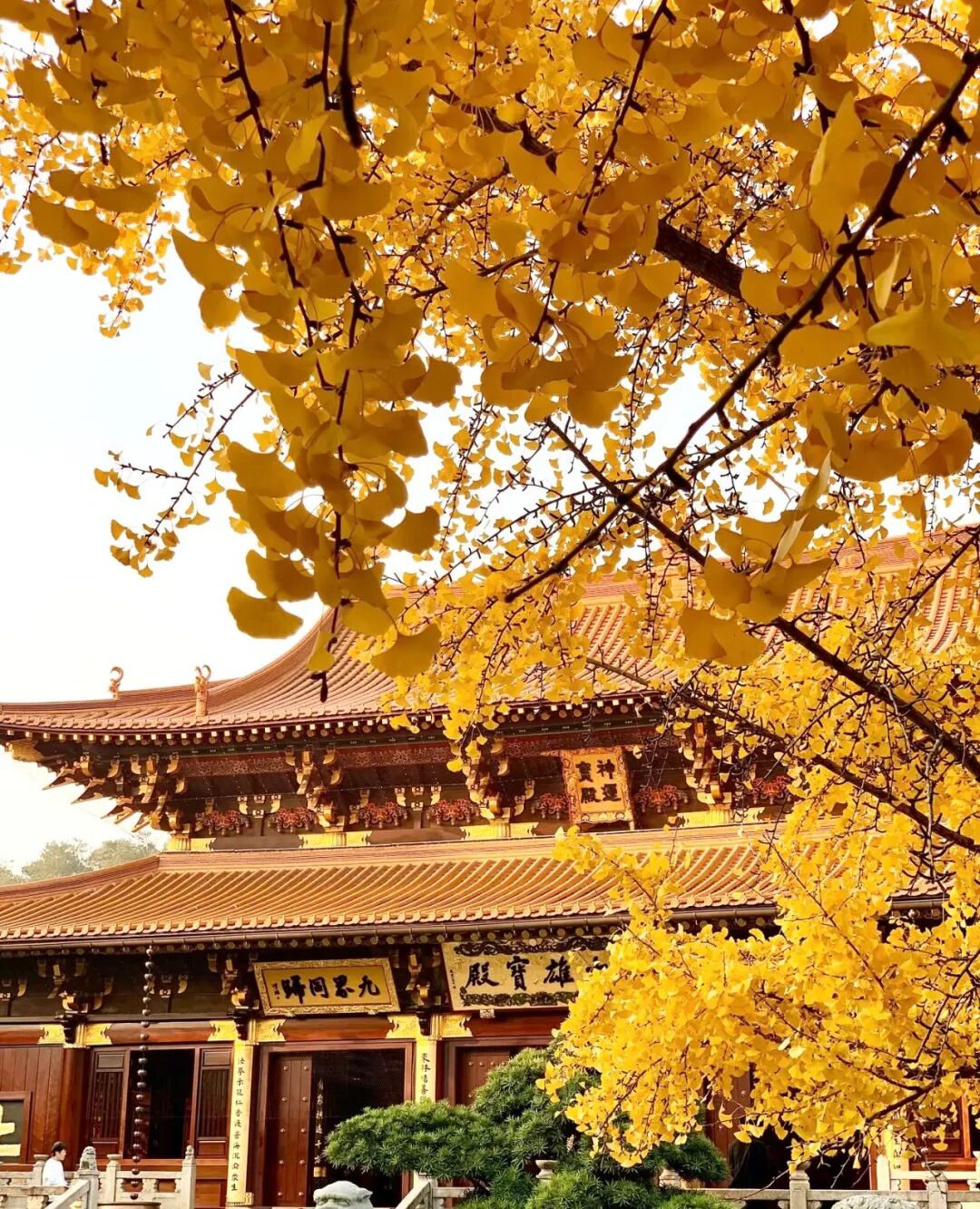 作为佛教净土宗发源地,东林寺的银杏自带穿越千年的厚重感。相传东晋慧远大师建寺时亲手栽种的古银杏,如今已亭亭如盖,树龄超1400年,需数人合抱方能环绕。每至11月中下旬至12月上旬,大雄宝殿前的四棵古银杏尽数披金,阳光穿透扇形叶片,在红墙琉璃瓦上投下斑驳光影,焚香炉升起的袅袅青烟缠绕枝头,禅意与秋意在此完美交融。