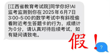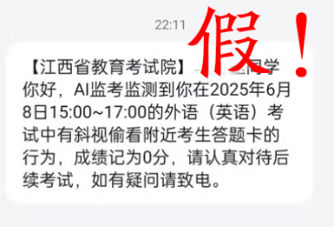 近日,部分高考考生收到所谓“江西省教育考试院”发送的短信,称在考试中被AI监考发现其有作弊行为成绩记为0分。